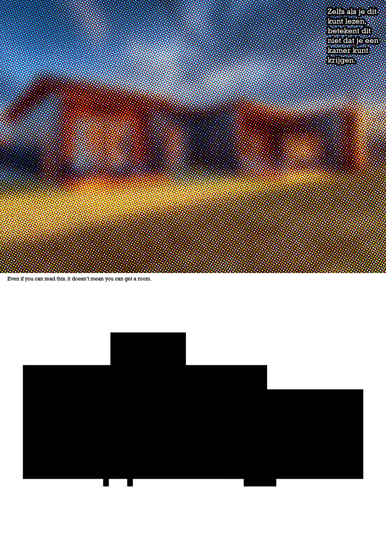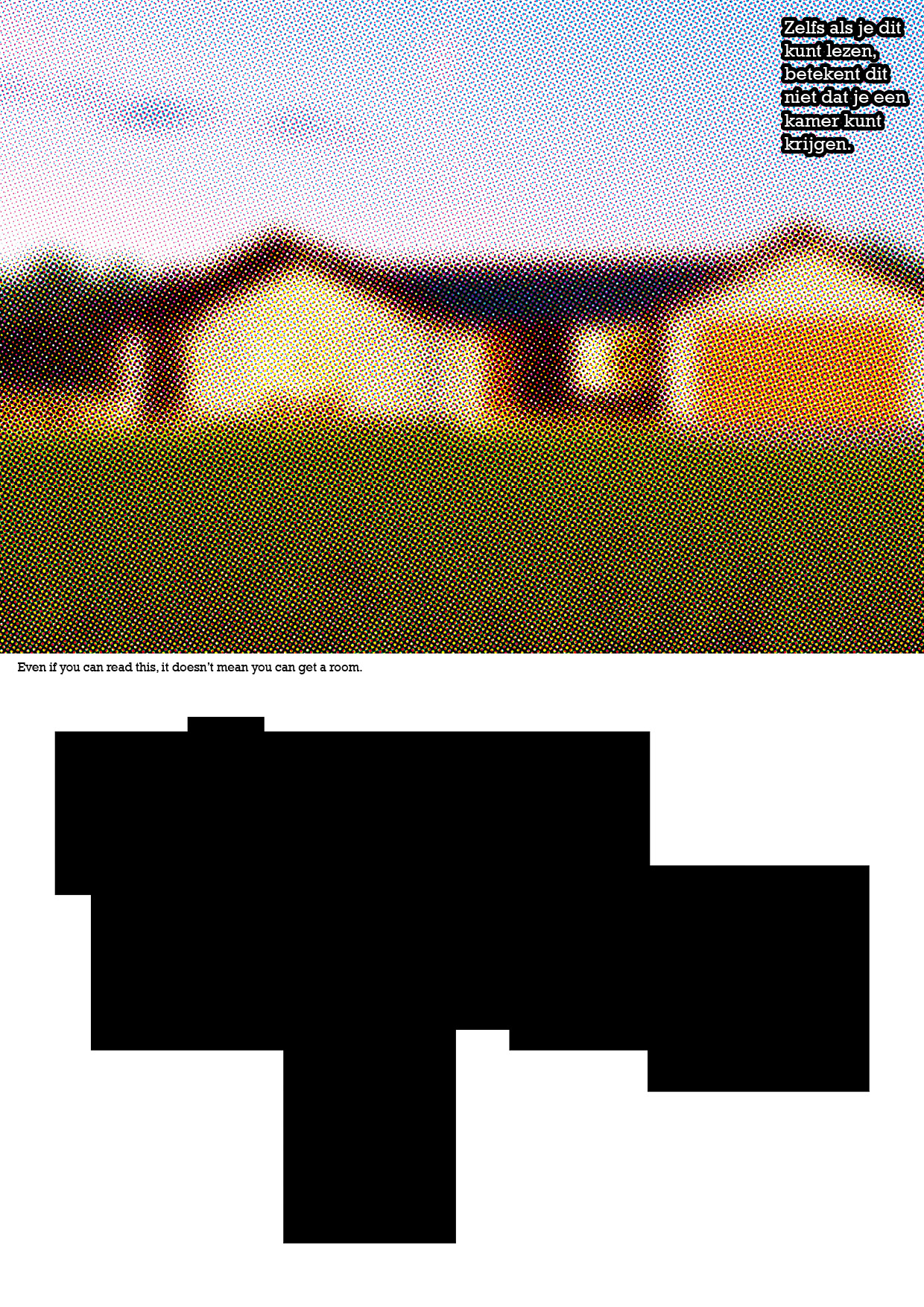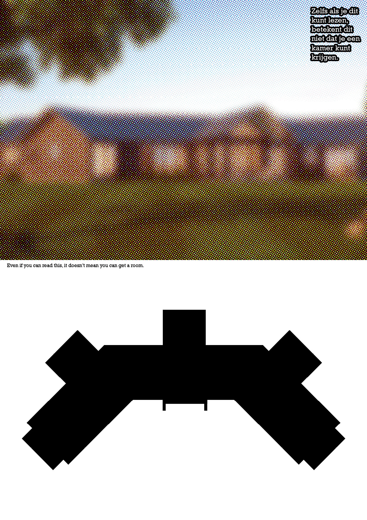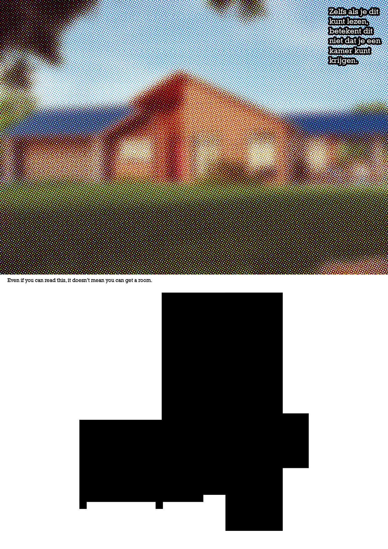 The image of the house seems a foggy, illusion, or fake. Below there is an image of the house's floor plan. There is written in dutch 'Even if you can read this, it doesn't mean you can get a house' and it is repeated in English in the middle.