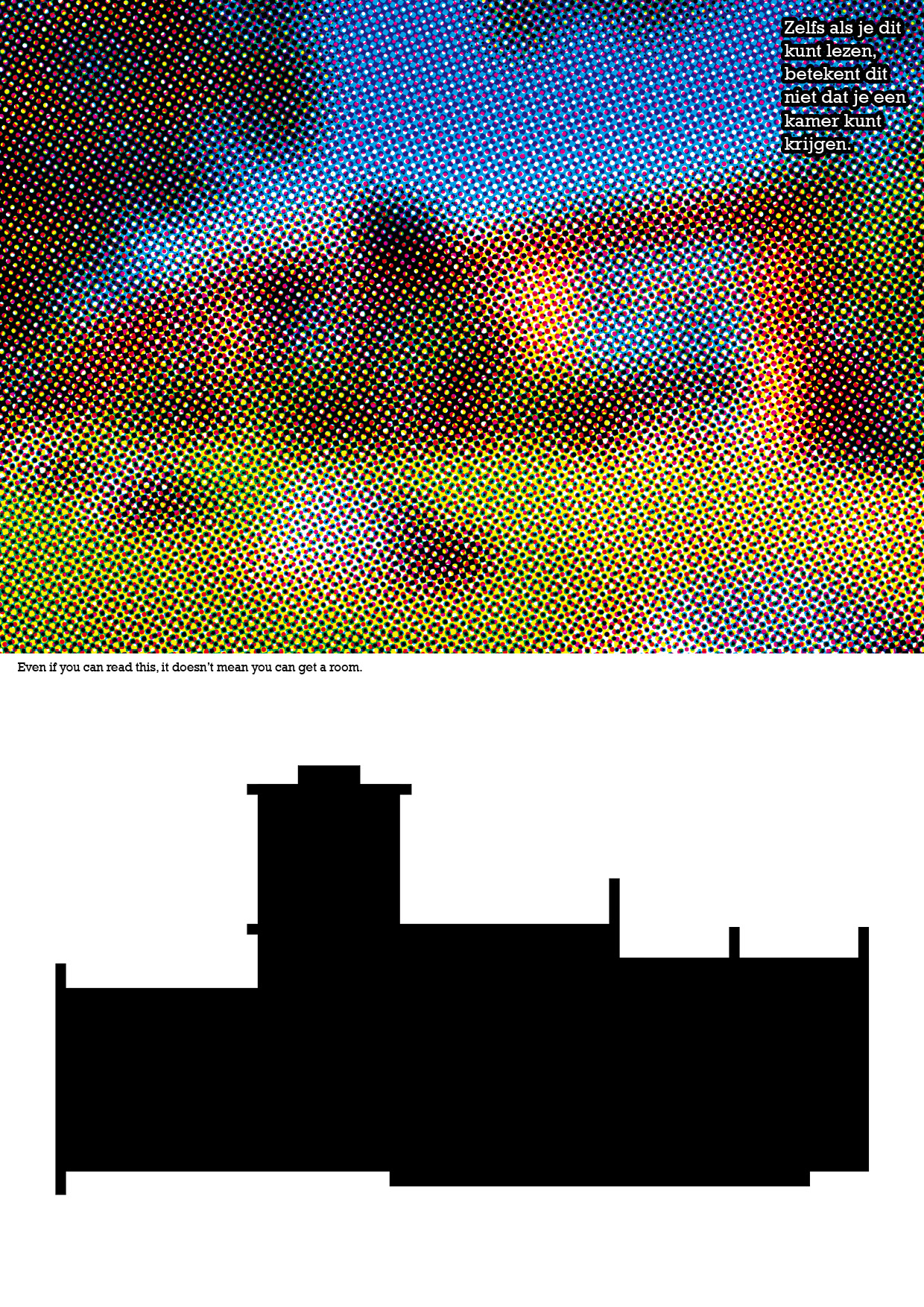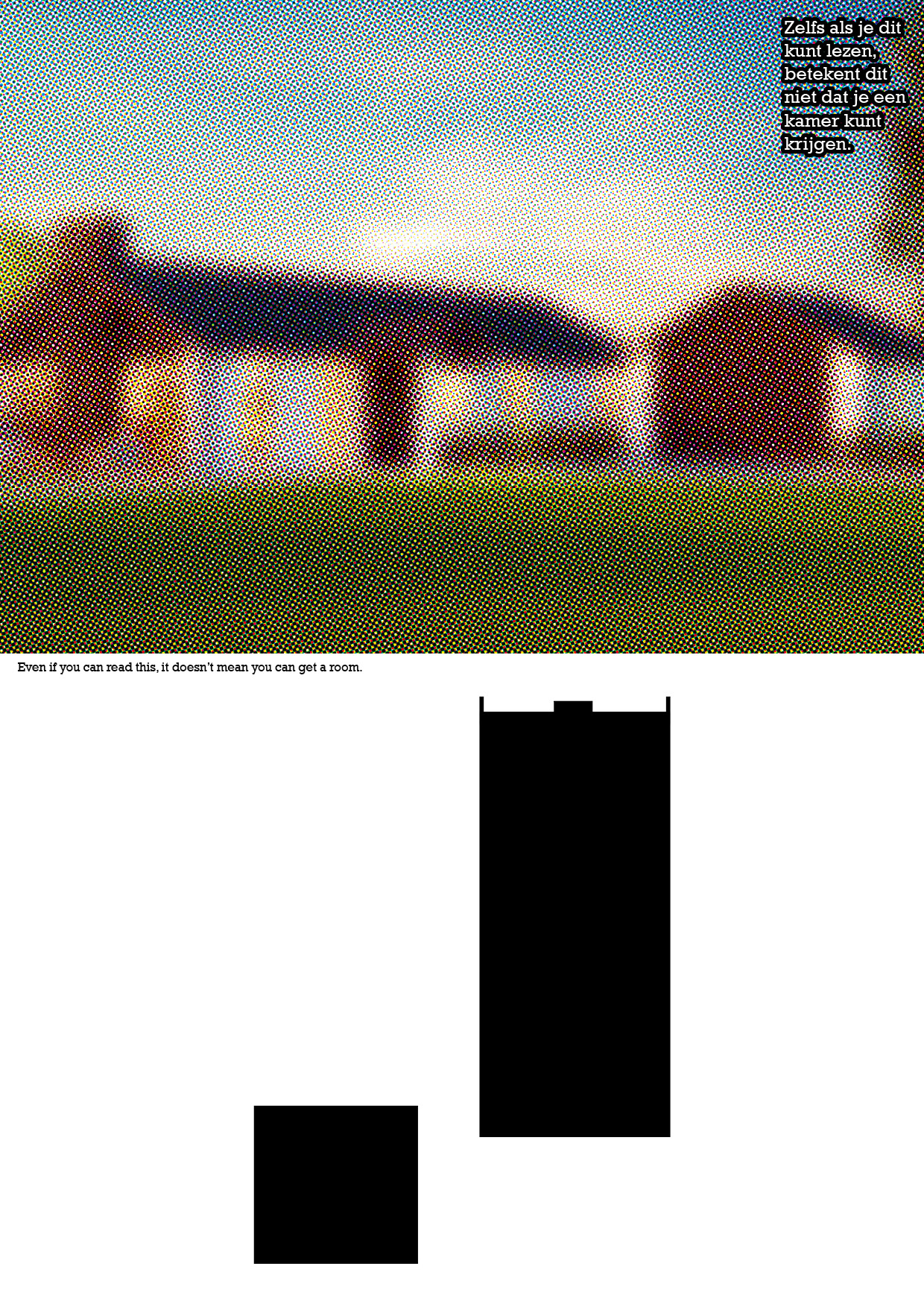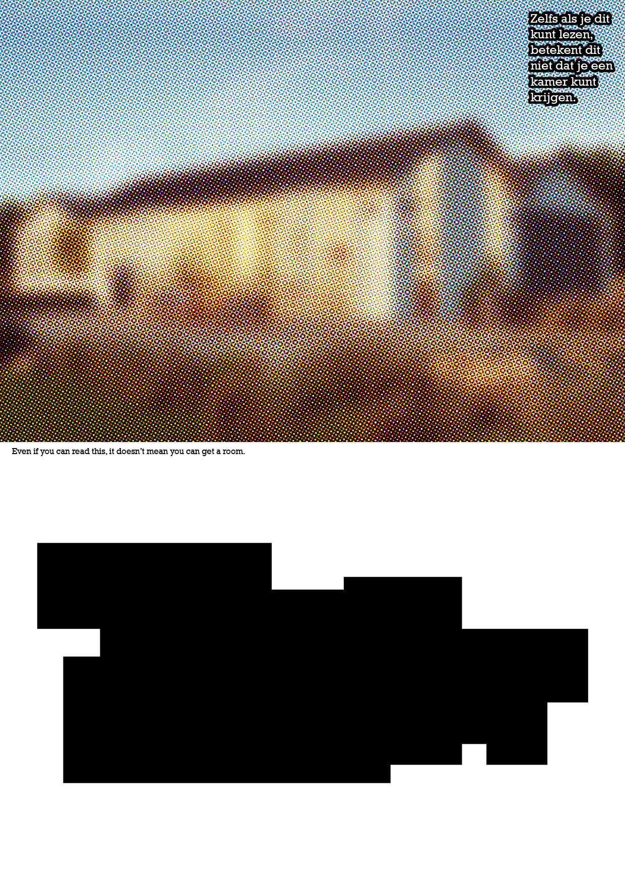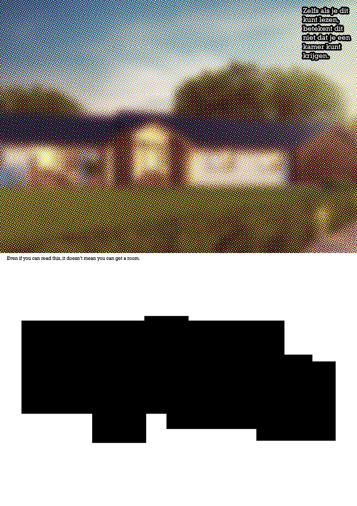 The image of the house seems a foggy, illusion, or fake. Below there is an image of the house's floor plan. There is written in dutch 'Even if you can read this, it doesn't mean you can get a house' and it is repeated in English in the middle.